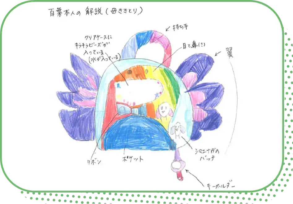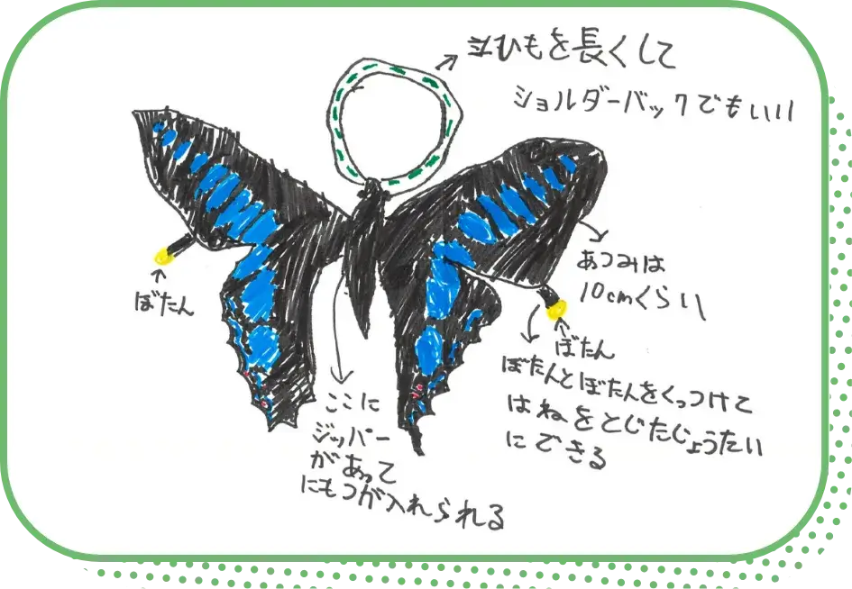 絵が細かいところまで丁寧に描かれていて、形や色にこだわりがあり、鞄にするのは難しいと思いますが、少しでもしおりさんが思うアオスジアゲハらしい鞄ができ、喜んでもらえるように頑張って製作したいと思います。