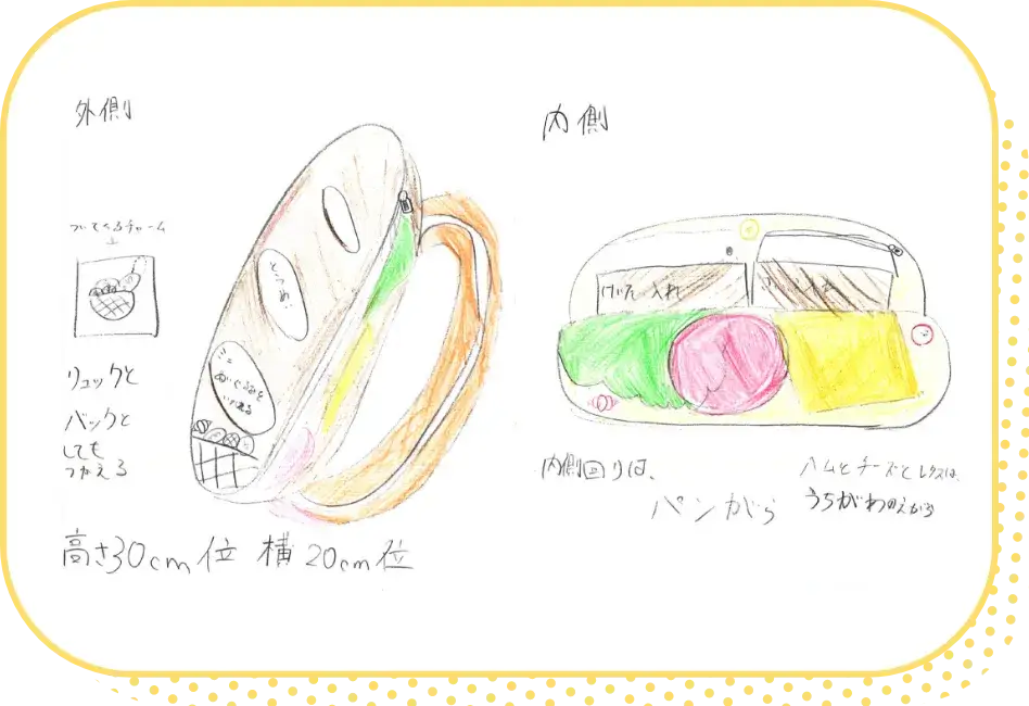 この絵を見た時に美味しそうなパンの鞄を作ってみたいと思いました。また絵を見ていると実現するためののアイデアがたくさん出てきた絵でもあったので実現してみたいと思いこの作品を選びました。