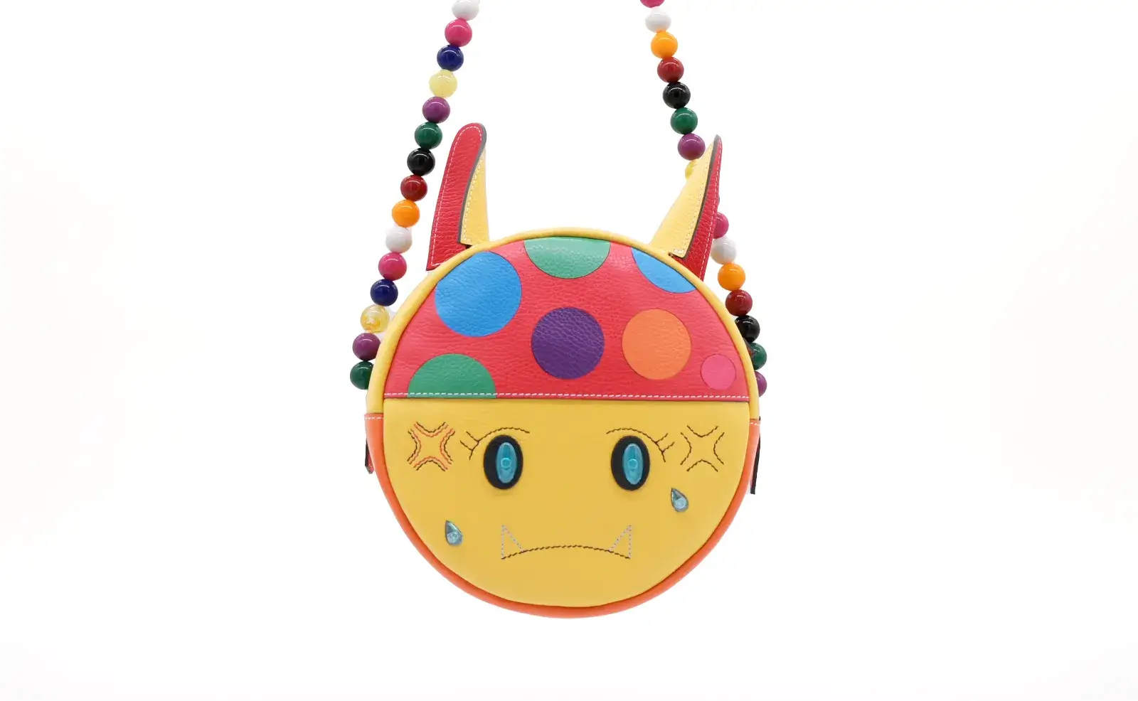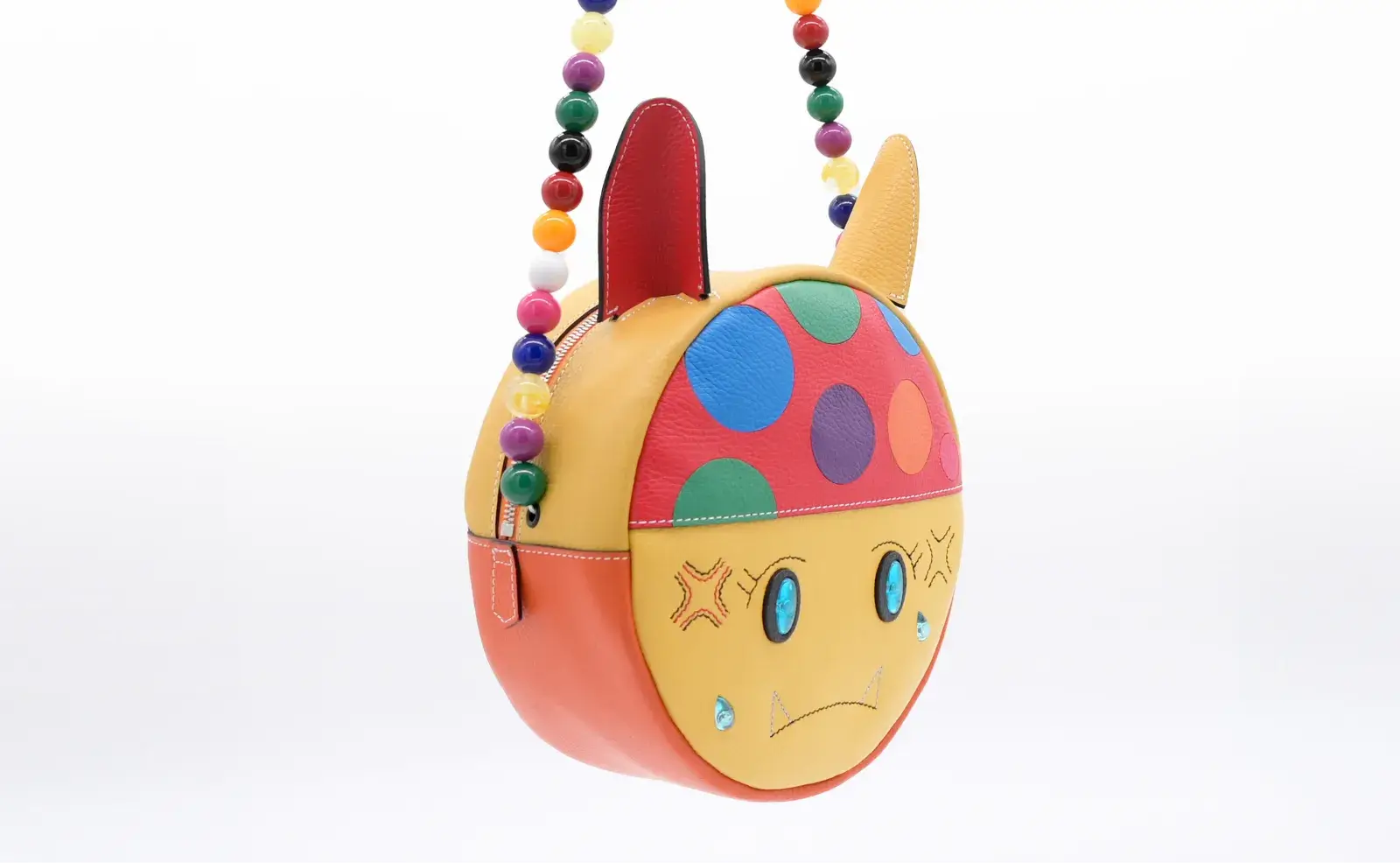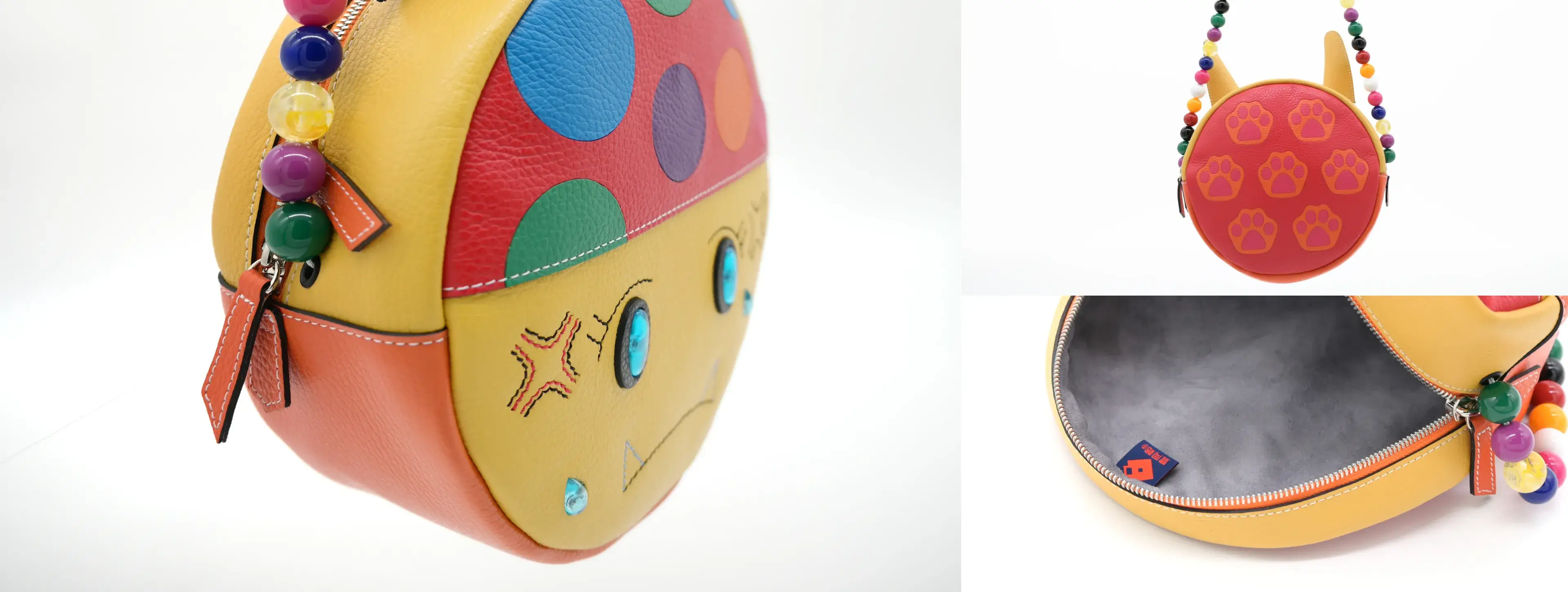 ドットと肉球のパーツは輪郭が綺麗に仕上がるように、目止め液をつけて角を丸めるように磨きました。これらのパーツを縫わずにくり抜き部分に貼り付けるのが難しかったです。また、マイクロコードにビーズを通してショルダーベルトを作りましたが、最後にビーズが抜けないように結ぶ工程も苦労しました。ビーズ同士に隙間ができないように保持しながら丈夫に結ぶ必要があるからです。
