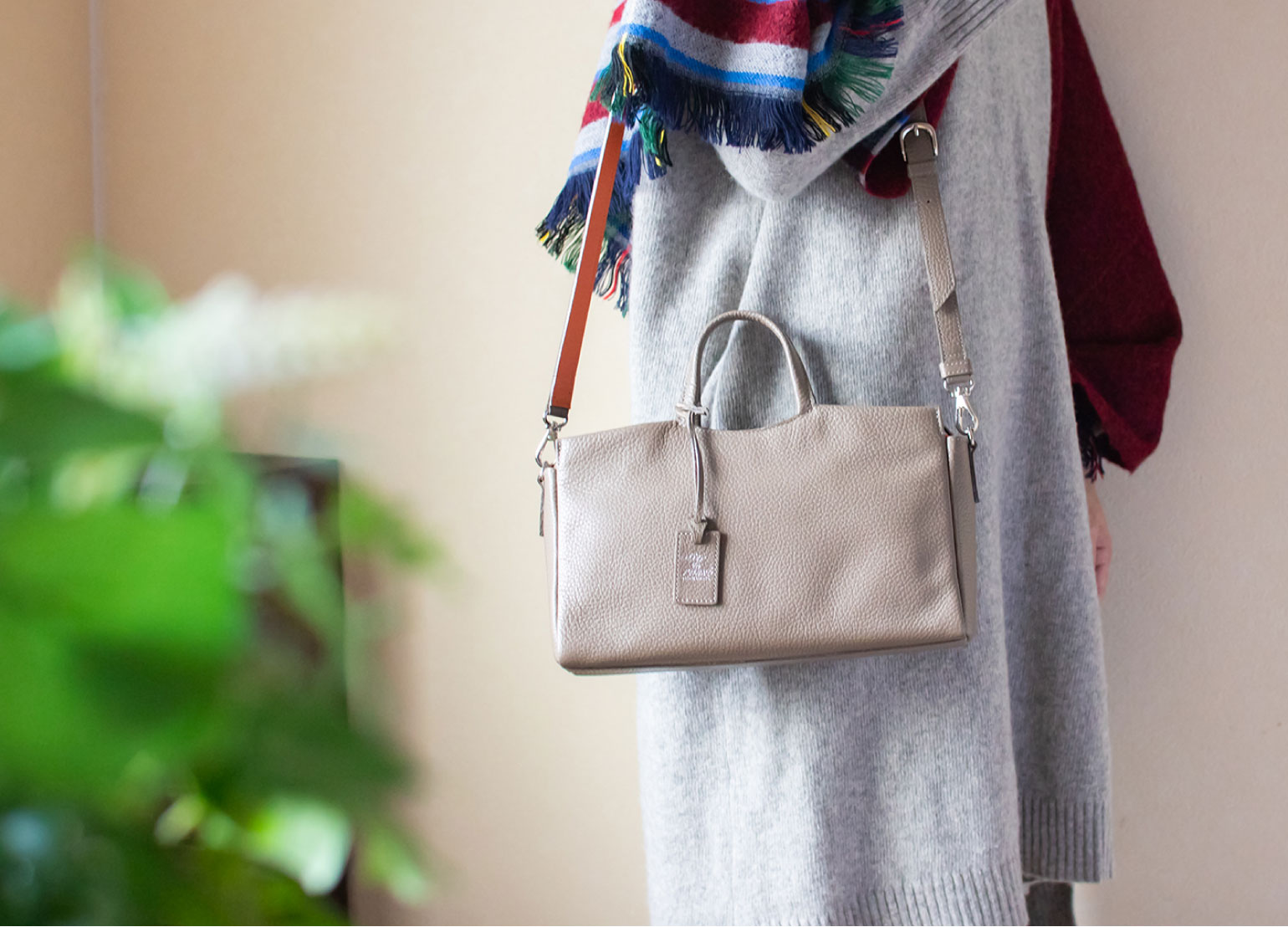 高機能素材でありながらデザイン性も担保された美しいフォルムのお散歩ショルダーバッグ。柔らかな手触り、温かみのある色合いがよりいっそう女性らしさを引き立てます。