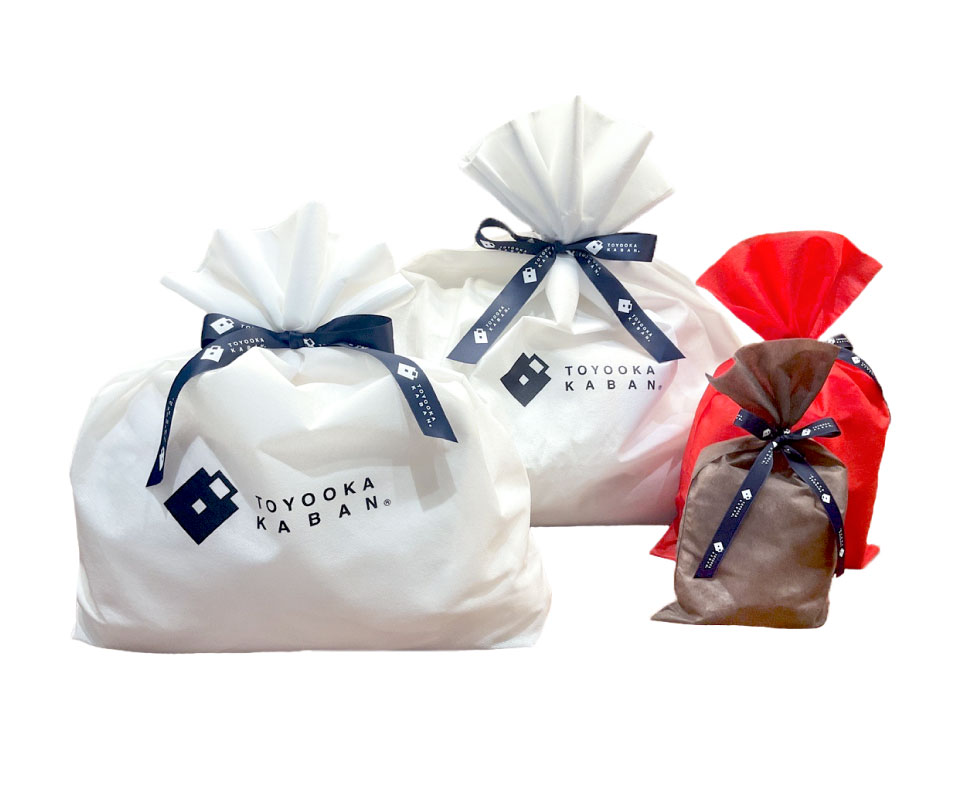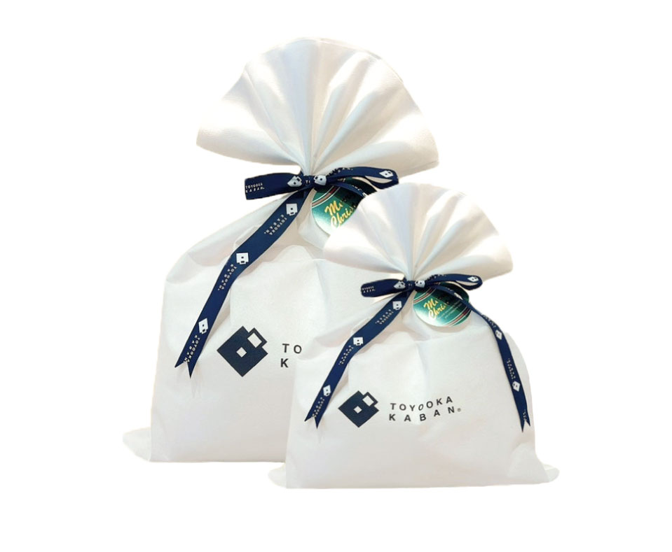 豊岡鞄オリジナルデザインの不織布にリボンをかけて丁寧にお包みいたします。