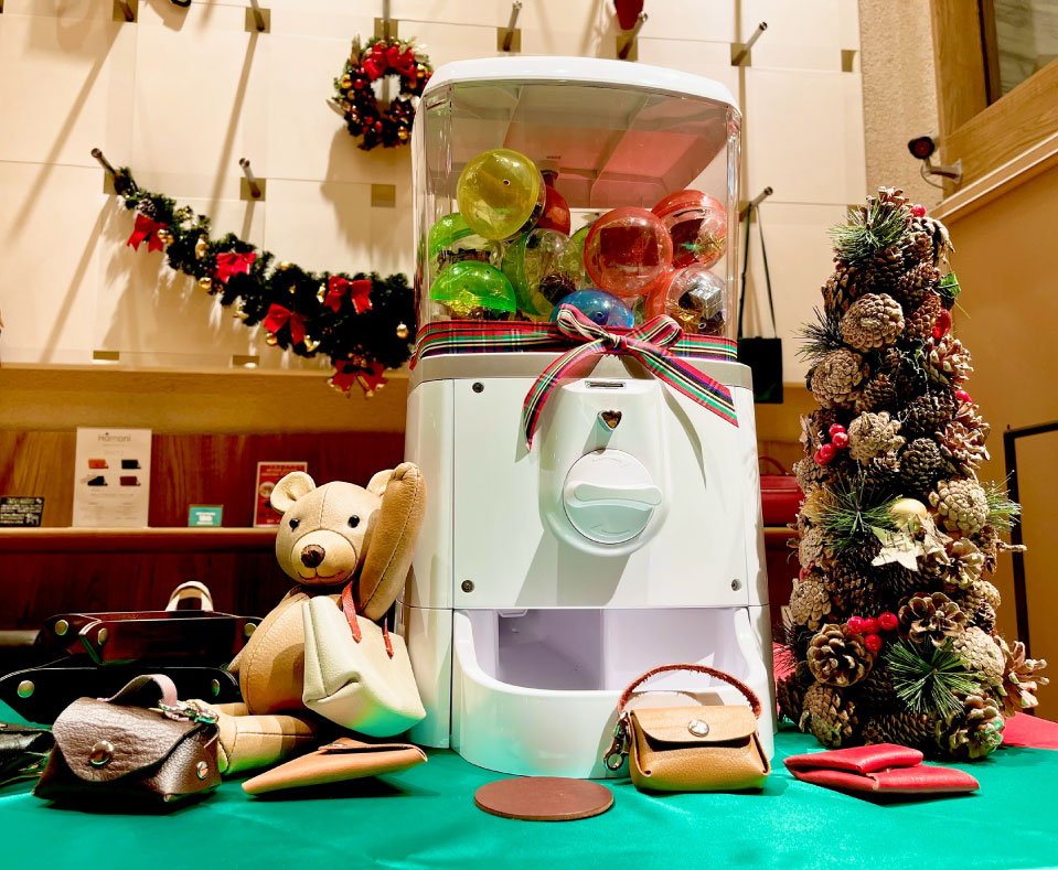 12/1~12/25の期間中、お買い物いただいたお客様に(条件あり)革小物などが当たるガチャに挑戦いただけます。