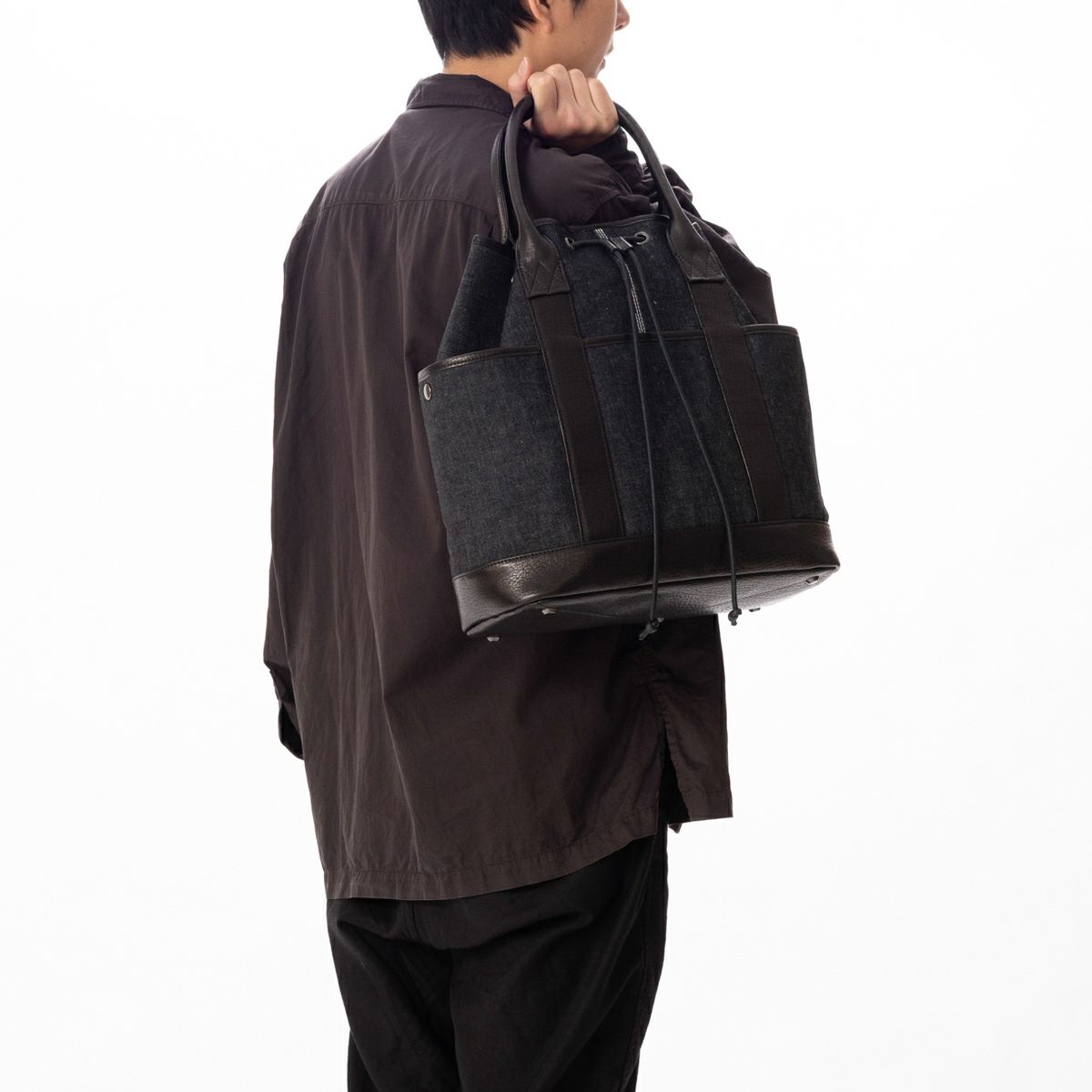 男性でも持お使いいただける巾着型のトートバッグ。