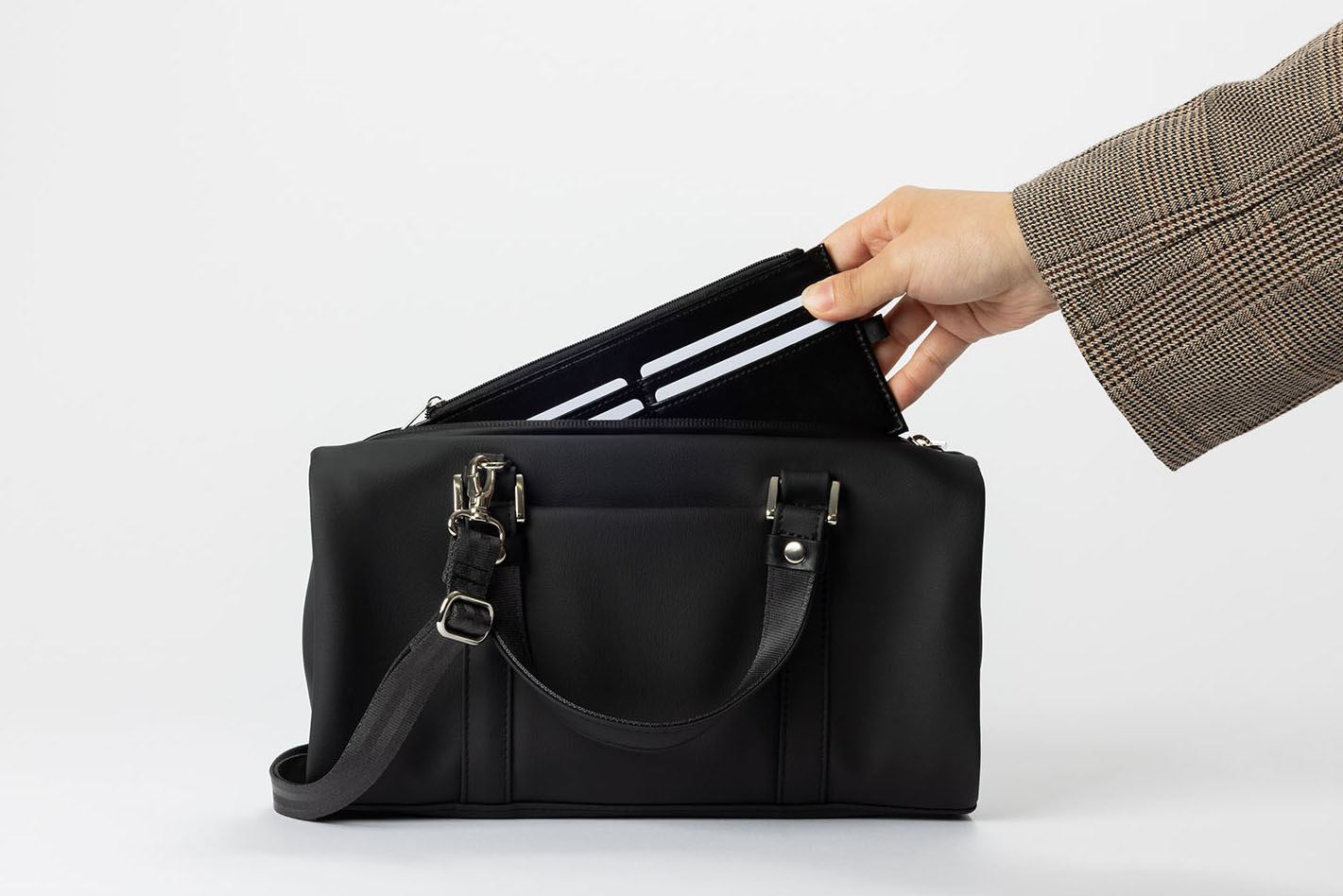 前胴のオープンポケットと内装の仕切りで、見た目以上の収納を実現。日常から旅先まで活躍する、2way仕様の機能派デザインです。